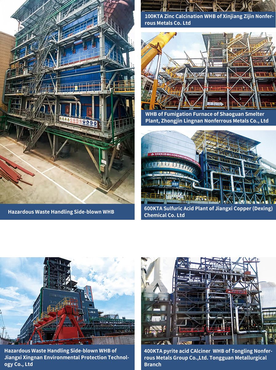 The waste heat boilers designed, manufactured and erected by our company serve major non-ferrous smelting enterprises at home and abroad, such as Jinchuan Group, Zijin Mining, Jiangxi Copper, China Copper, Yunnan Tin, Chihong Zinc and Germanium, etc., accounting for more than 90% of the non-ferrous market. Through years of painstaking research on waste heat boilers such as copper smelting (flash furnaces, side-blown furnaces, bottom-blown furnace, copper oxygen rich top-blown furnaces, Osmet furnaces, Isa furnaces, etc.), tin smelting (Osmet furnace waste heat boilers), lead and zinc smelting (Kifset furnaces, side-blown furnaces, bottom blown furnaces, fumigation furnaces, reduction furnaces, roasting furnaces, rotary kiln waste heat boilers) considering all kinds of smelting process characteristics, based on the characteristics of large dust content of flue gas, strong adhesion, strong corrosiveness and large fluctuation of flue gas cycle, the corresponding furnace type has been developed by our R&D team. With high technical content and reliable operation, it has gained high recognition and trust from customers at home and abroad.